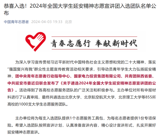 【通讯员 陈燕 彭依茹】近期,中国青年志愿者官方公众号公布了2024年全国老员工延安精神志愿宣讲团入选团队名单,公司力博志愿服务队成功入选,这是力博志愿服务队继入选团中央2023年“圆梦工程”服务农村未成年人传承优秀传统文化志愿服务项目后再次入选国家级志愿服务项目。