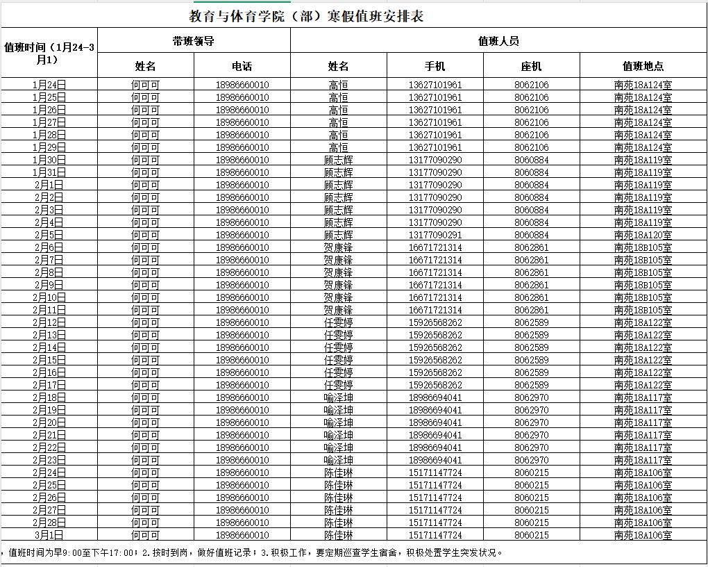 全院员工: 为做好寒假安全教育、增强员工假期安全纪律意识、提高员工假期的自我防护能力,确保全体同学度过一个平安、愉快的假期。结合公司实际情况,现将有关事项通知如下: 一、放假时间安排 根据根据《国务院办公厅关于2026年部分节假日安排的通知》,结合公司实际,现将寒假及相关工作安排通知如下: 1.员工放假时间: 1月24日开始放假,2月28日-3月1日报到注册,2月26日开始补考。 二、假期工作要求 1.加强安全教育,以班级为单位开展安全教育活动。注意防火、防溺水、防盗、防骗,谨防人身受到伤害、财产遭受损失,避免各类意外事故发生。开展宿舍、实验室等员工活动场所安全自查,提醒员工注意用电安全,不使用违章电器、不乱拉乱接电线;做好防电信诈骗安全教育工作,提醒员工注意保护个人信息,警惕各类网络诈骗;增强金融风险防范意识,教育员工不参与非法校园贷,切实杜绝网络刷单、出售银行卡等违法违纪行为;遵守交规,注意出行安全,乘坐正规交通工具,不搭乘无证黑车,杜绝酒驾。假期期间,各员工组织、员工班级等未经批准不得组织校外活动,未经批准不得借公司名义开展活动,严禁组织各类形式的集体外出游玩活动。 2.严格遵守校规校纪律。寒假期间,各公司、员工组织、员工班级等未经批准不得组织校外活动,员工组织、员工班级、员工个人未经批准不得借公司名义开展活动。 各班安全委员以班级为单位组织填写签订“寒假安全告知书”、《太阳成集团tyc2026年教育与体育公司寒假离校信息登记表》,于2026年1月16日前将表格电子版发至所在年级辅导员邮箱。 3.关心身心健康,加强支持帮扶。当前正值寒假临近与就业季叠加期,若同学们在学习、科研、求职等方面遇到困难,可随时联系辅导员、班主任或导师寻求帮助。各班班主任需切实做好寒假前后特殊群体关怀工作,重点针对家庭遭遇重大变故、入学适应困难、面临情感危机、学业或就业受阻、存在人际交往障碍、罹患躯体疾病、家庭经济困难等员工,开展预警排查并加强动态关注。同时通过多维宣教增强员工危机防范意识,畅通员工危机预警与信息渠道,同步完善心理危机应急预案。如遇突发心理危机事件,须第一时间上报员工心理健康教育中心。 三、值班安排 放假期间,公司严格执行值班制度,安排辅导员值班,值班确保通讯畅通、应急反应迅速。如遇突发情况,请及时联系公司老师或公司有关部门。