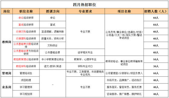 为了更好为社会全体提供优质的公考培训服务,更好得搭建公司内部团队人才梯队,现向社会全体和各大高校广纳人才,引荐优秀的力量!