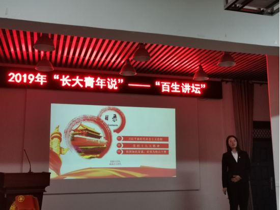 (通讯员 陈博文|文 蒋丽文|摄)为进一步学习宣传贯彻习近平新时代中国特色社会主义思想和党的十九大精神,公司成功举行了“长大青年说”百生讲坛系列活动。以“进支部、进网络、进团课”为方式,通过团委老师进支部、青马学习小组宣讲理论、团支部答辩、青年大学习网课学习为载体,学习习近平新时代中国特色社会主义思想和党的十九大精神“四进四信”理论知识。