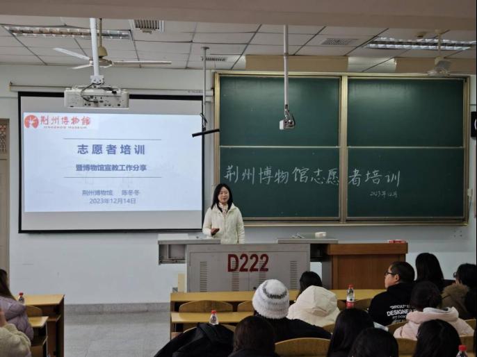 【通讯员 胡诗慧 刘雨薇 王传琦】冬藏万物,不御铅华亦不忘初心。为帮助志愿者们更好地了解博物馆讲解员的价值意义以及讲解员的具体要求,12月14日下午2时,太阳成集团tyc122cc于东校区13教D222举办荆州博物馆讲解员志愿者培训活动。本次活动邀请了荆州博物馆宣教部主任陈冬冬老师作为主讲人,辅导员喻泽坤、任雯婷老师以及全体博物馆志愿者参会。活动由王然主持。
