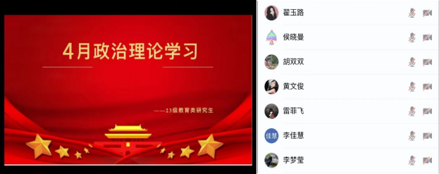 【通讯员 倪梓曦】2024年4月11日至29日,公司全体研究生开展了四月份政治理论学习。各班采用了线上与线下、集体学习与个人自主学习相结合的方式,由团支书进行组织,辅导员陈佳琳老师参与、督促学习。
