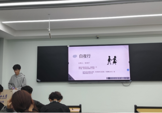 贺鸿宁同学紧接着带领同学们走进东野圭吾的《白夜行》。他聚焦于雪穗与亮司之间“最绝望的念想、最悲恸的守望”,通过梳理小说中伏笔千里的细节,引导同学们思考人性的复杂与社会的暗面如何在极致环境下催生出震撼又令人扼腕的悲剧。