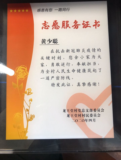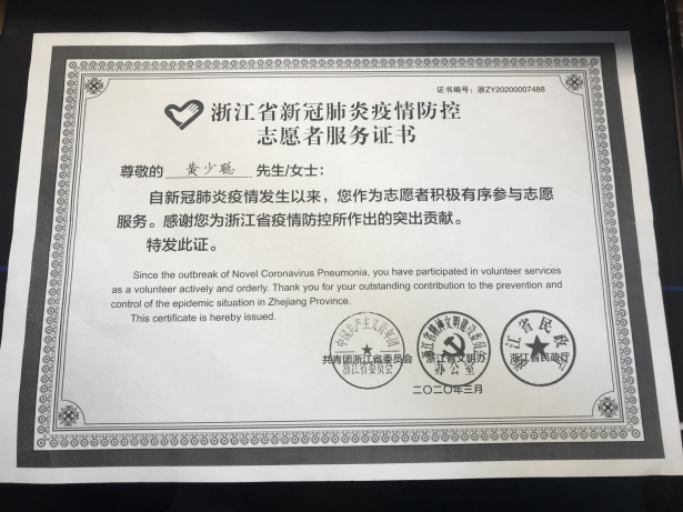 在此次疫情中,作为一名中共党员,担负社会责任义不容辞。我自愿报名参加志愿者,在本村的的疫情防控的卡点值班,为出入的村民测量体温;为外来人员登记信息并汇报至村委会;为行动不便的村民送取物资…获得了浙江省民政厅颁发的浙江省新冠肺炎疫情防控志愿服务证书。