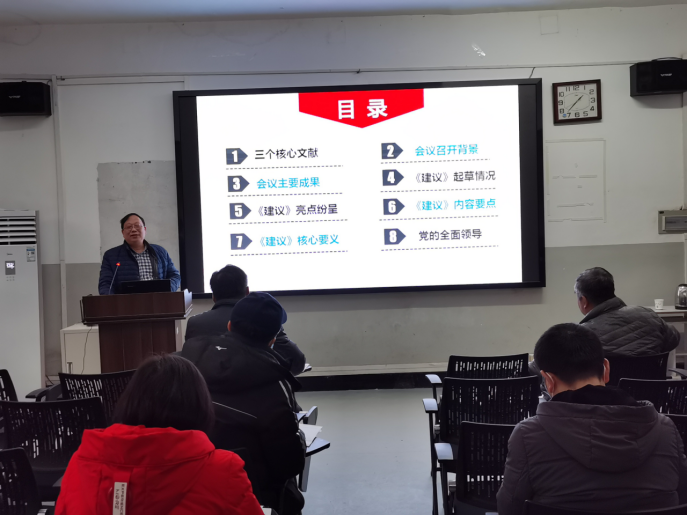 为深入学习十九届五中全会精神,切实贯彻公司党委相关工作指示和要求,公司于12月10日下午在5教203组织开展了十九届五中全会精神学习报告会。人文社科处彭开智副处长受邀为公司全体教职工做专题辅导报告,活动由李则俊副书记主持。