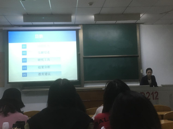 首先进行报告的是袁斯同学,她就“乡镇中心幼儿园教师生存状态的调查研究--以湖北省M市为例”进行汇报,主要阐述了整个论文的提出、目的及意义、文献综述、概念界定、理论基础、研究设计以及建议这几个部分,通过较大任务量的文献研究以及问卷调查来获取大量数据作为其论证基础。