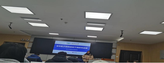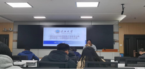 第五位是丁凤同学,她以“身体活动与体质弱势老员工学习倦怠的关系:心理弹性的中介关系”做了专题汇报。简单介绍了什么是学习倦怠,什么是心理弹性并提出假设:心理弹性可否作为中介变量对体育锻炼与学习倦怠间的关系起到部分/完全 中介作用?应用体育活动等级量表、老员工学习倦怠量表、心理弹性量表为研究工具进行了详细的学术汇报。