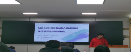 最后是体育教学专业的薛超宇同学,以“MOOC教学对体育心理学课程学习表现影响的研究”随着信息化发展推动着教学模式的改革以及高校课程线上教学改革已成必然趋势为研究背景,以实验法、文献资料法等研究方法进行详细汇报。