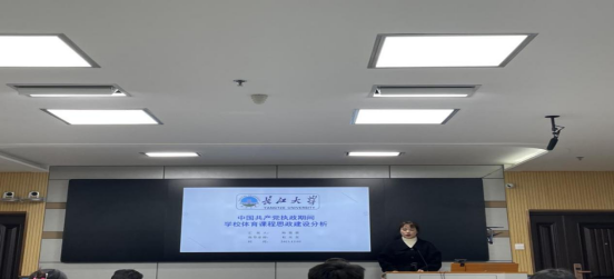 首先是陈露露同学,她就“中国共产党执政期间公司体育课程思政建设分析”做了专题报告。从体育与课程思政和不同时期的体育与课程思政两个部分展开,她提出体育教学理念的转变定义,并对课程思政的提出进行详细的介绍。