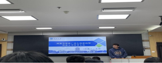 接着是王帅同学,他以“溯源与传承:历久弥新的鄂西南土司体育文化”做了专题报告。他运用田野调查法、专家访谈法、逻辑分析法、文献资料法等研究方法进行土司文化溯源与传承详细汇报。