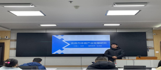 其次是杜宇同学,他就“宜昌市体育产业发展研究”做了专题报告。他从介绍比较优势理论、宜昌市体育产业发展现状、宜昌市体育产业比较优势分析三个主体部分开展详细汇报。