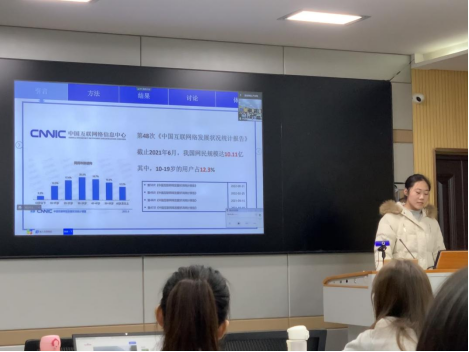 鲍玲玲同学就智能手机成瘾的代际传递机制:基本心理需要的中介和自我期望的调节作用做了专题报告。她从选题背景、文献综述、研究方法、结果、讨论、不足和展望,表达了自己的观点和看法,并对其进行理性的分析和思考。