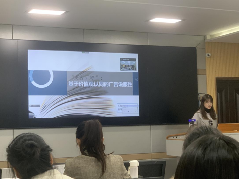 马芝娟同学就“寓教于购:基于价值观认同的广告说服性”的研究设计做了专题报告。她主要是从双关的含义入手,分析了不同价值导向的双关语广告对于说服性的不同影响,介绍了被试为在校老员工、正向价值导向的双关语广告为自变量、消费目的为调节变量、产品信任度为因变量的实验设计。