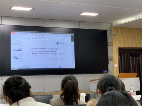 苏岁岁就“The Chain Mediating Roles of Empathy and Kindness”的论文做了汇报。她主要从研究背景、概念介绍、理论基础、提出假设等四个方面来进行讲解。