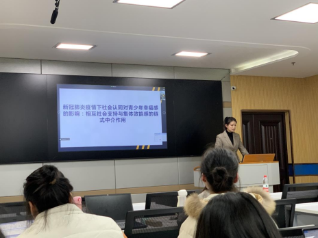 吴新丽同学就“新冠肺炎疫情下社会认同对青少年幸福感的影响:相互社会支持与集体效能感的链式中介作用”做了专题报告。她从问题提出、研究方法与思路、文献综述、预期结果、讨论、后续工作的顺序展开了汇报。