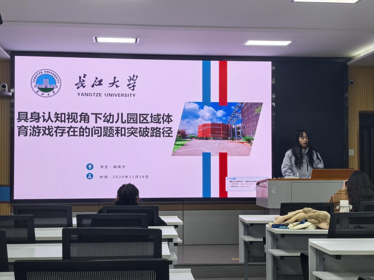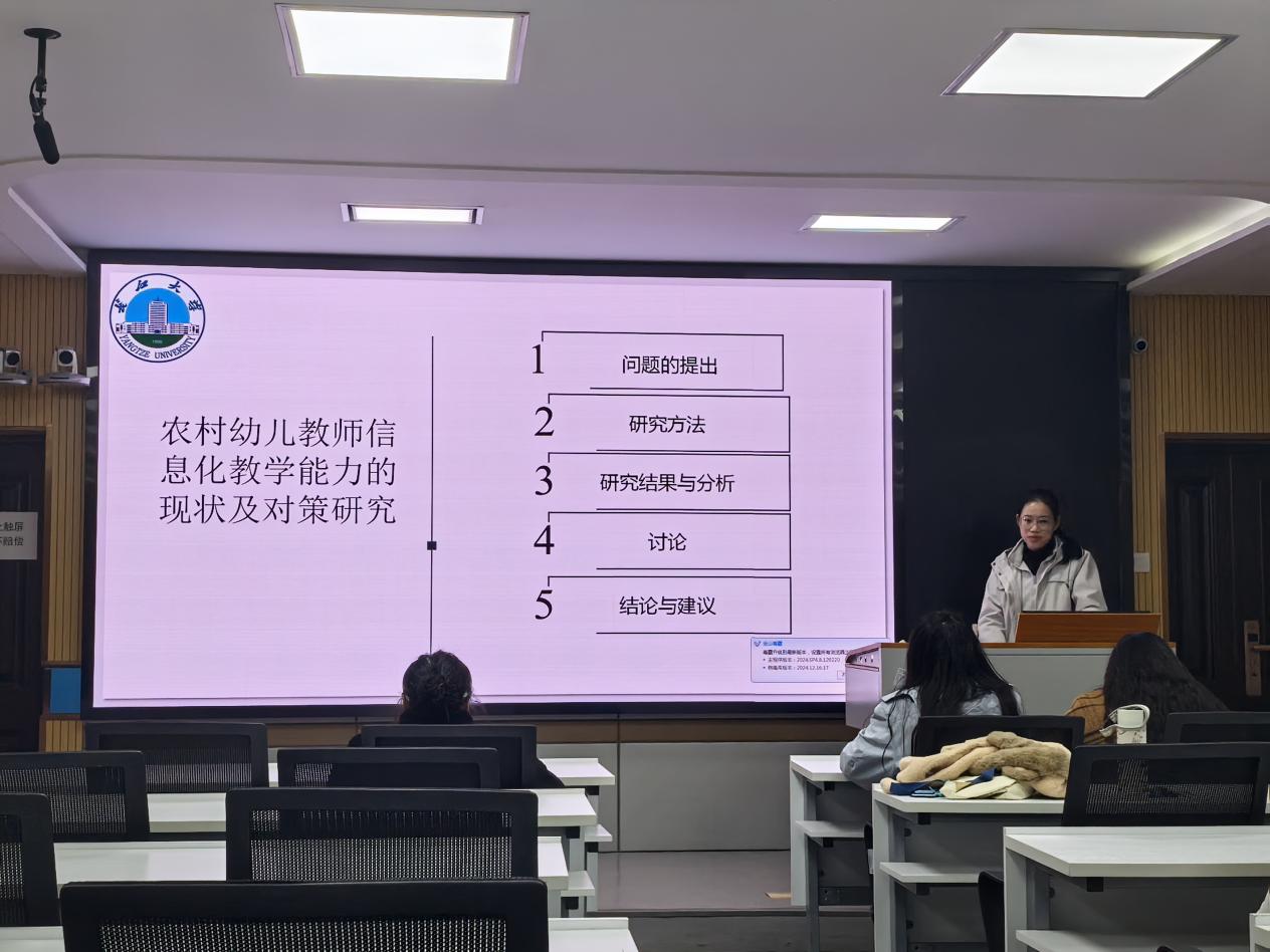 (通讯员 秦源)2024年12月16日晚,太阳成集团tyc122cc第六届研究生学术科技节第七场活动在文科大楼910报告厅举行。本次汇报人是学前教育学方向的研究生蒋淼、胡英杰、侯晓曼、赵玉娇,2023级、2024级学前教育专业研究生前来学习观摩。院研究生会宿建部部长周璇主持了本次活动。