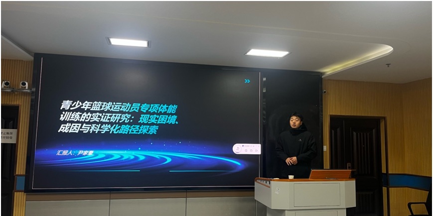 尹家豪同学汇报的主题为《青少年篮球运动员专项体能训练的实证研究》,该研究通过多维度调研,清晰揭示了当前训练中存在的现实困境,并从内外部因素深入剖析其成因。在此基础上,研究并未止步于问题分析,而是进一步开展了优化路径的实证探索,并通过案例对比,寻求科学训练理念的本土化创新方案。这项工作致力于推动青少年篮球训练从经验主导迈向数据驱动与科学指导的新阶段,对于夯实我国篮球后备人才基础具有重要意义。